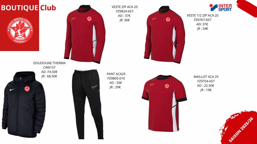 Vous pouvez voir les produits disponibles (doudounes, pantalons, sacs, t-shirts, vestes) et leur prix sur les plaquettes que vous pouvez télécharger ici : Etoile Mouzillon Football / Groupement Féminin Mouzillon-Vignoble ainsi que le bon de commande pour faciliter le remplissage de votre panier.